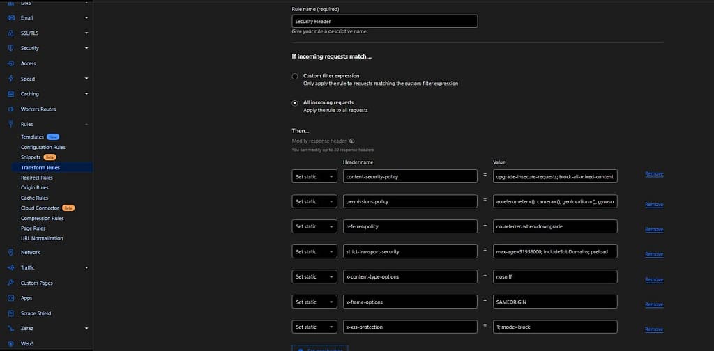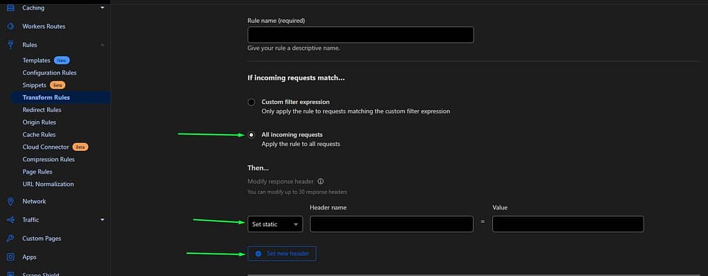 5 – Under Rule name, give your rule a name to identify it. Under If incoming requests match…, select All incoming requests and under Then… select Set static