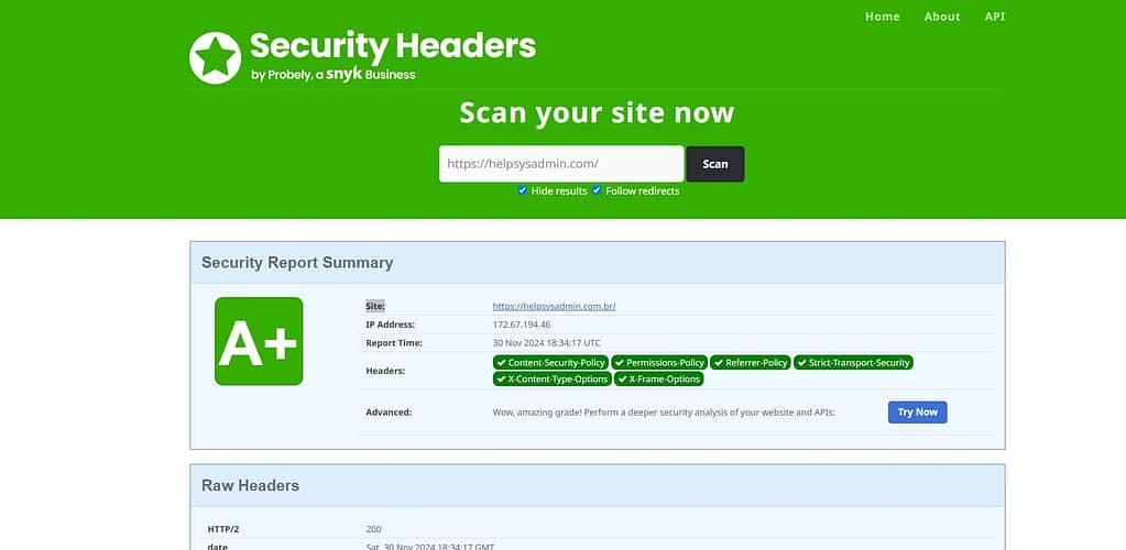 Now let’s test whether the security headers are OK on your site. Go to https://securityheaders.com/ , type in your domain and then click on scan. You will get this result: