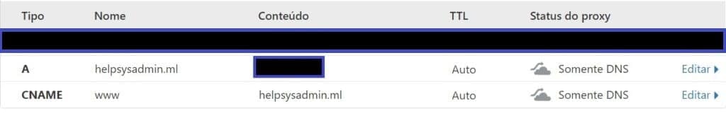 - Create a DNS entry of type A pointing the domain to the ip of the server