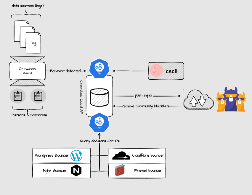 Bouncers: are plugins that block ips according to crowdsec “decisions” (BAN, CAPTCHA…) There are several types of integration such as iptables (default), cloudflare firewall, wordpress plugin, magento, windows server firewall and many others.