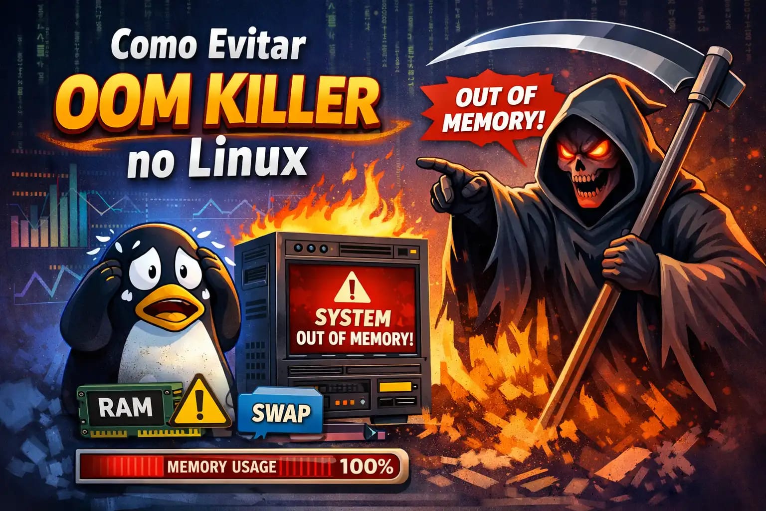 - OOM Killer (Out Of Memory Killer) é um mecanismo do kernel Linux que mata processos automaticamente quando o sistema fica sem memória RAM e swap.